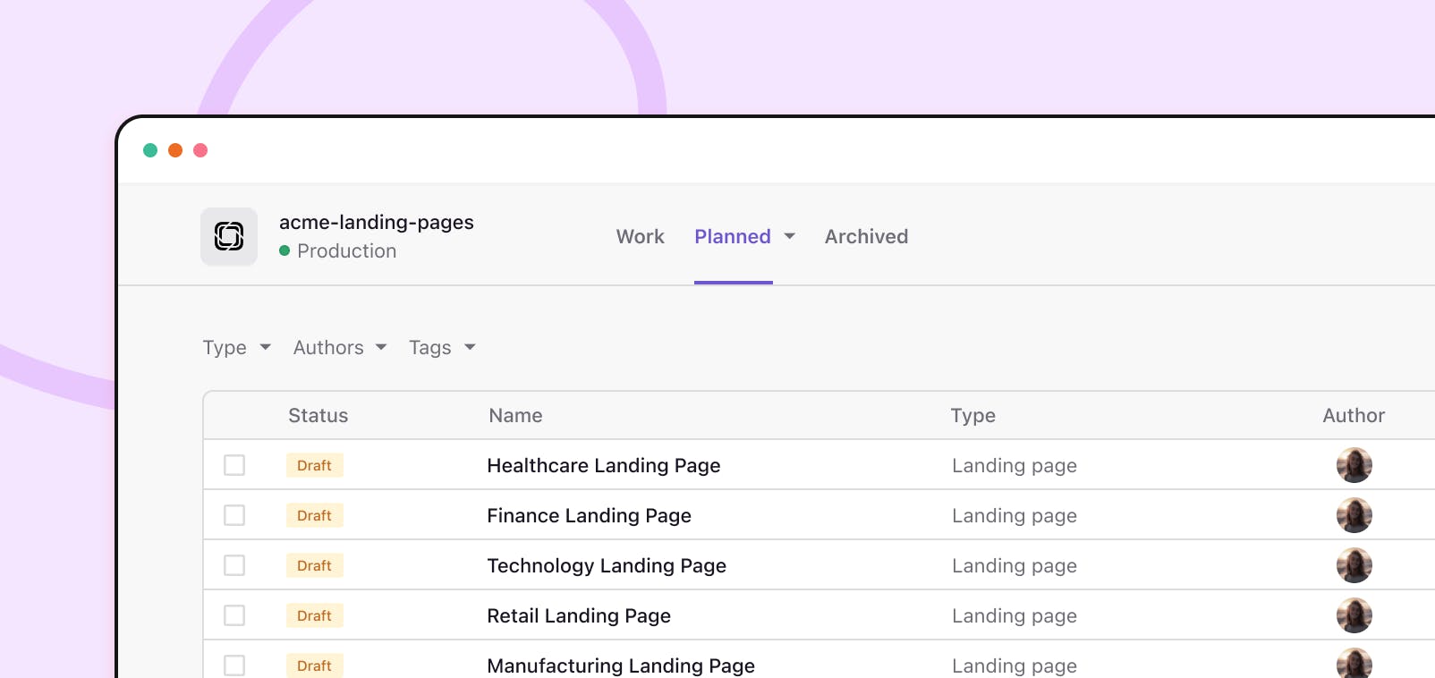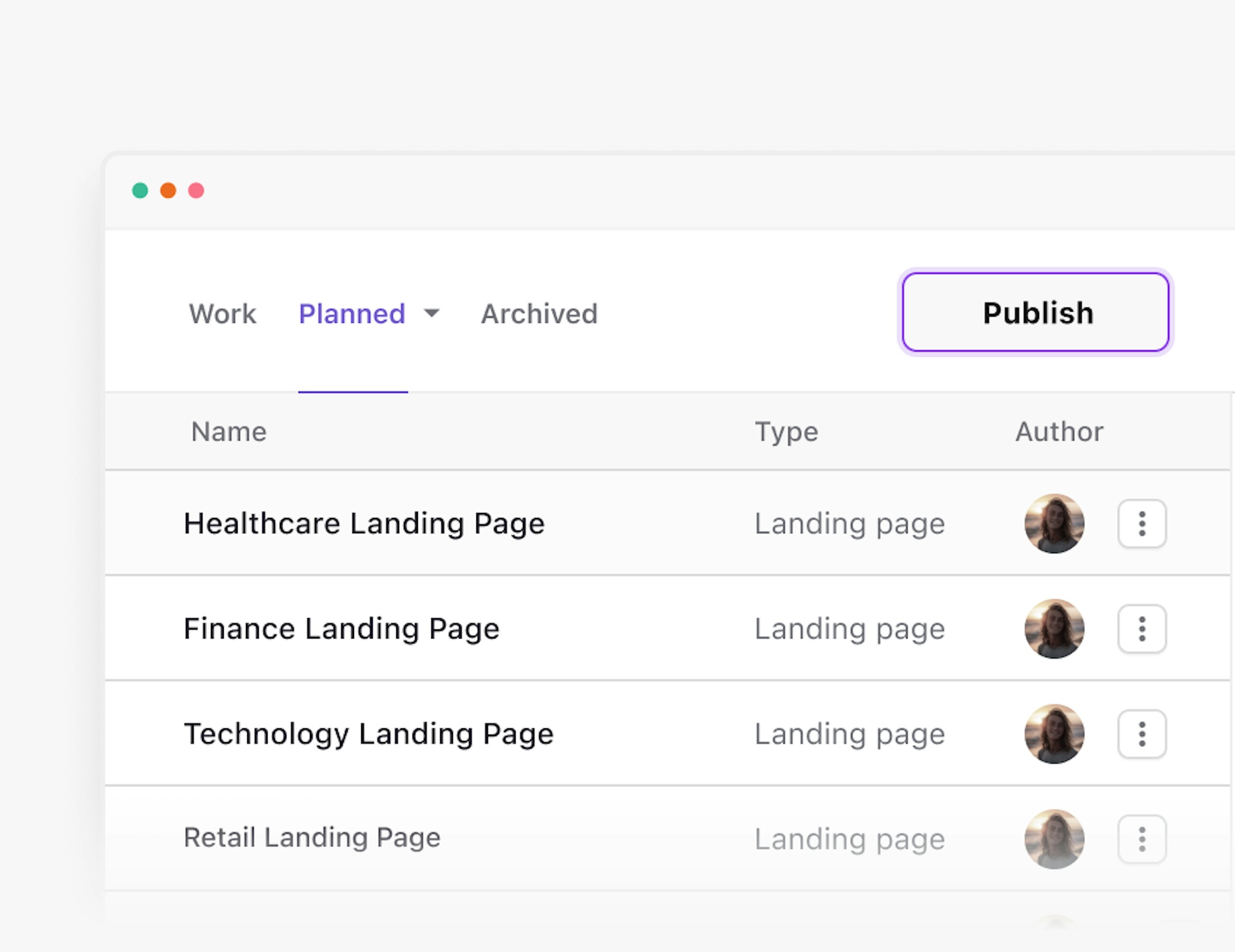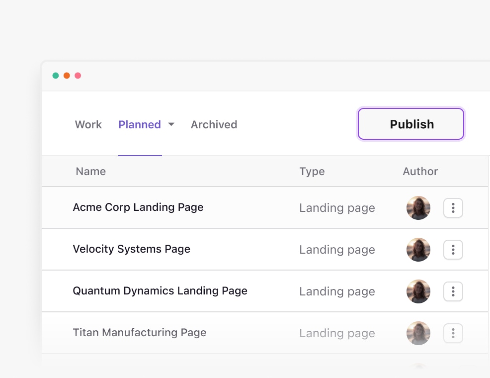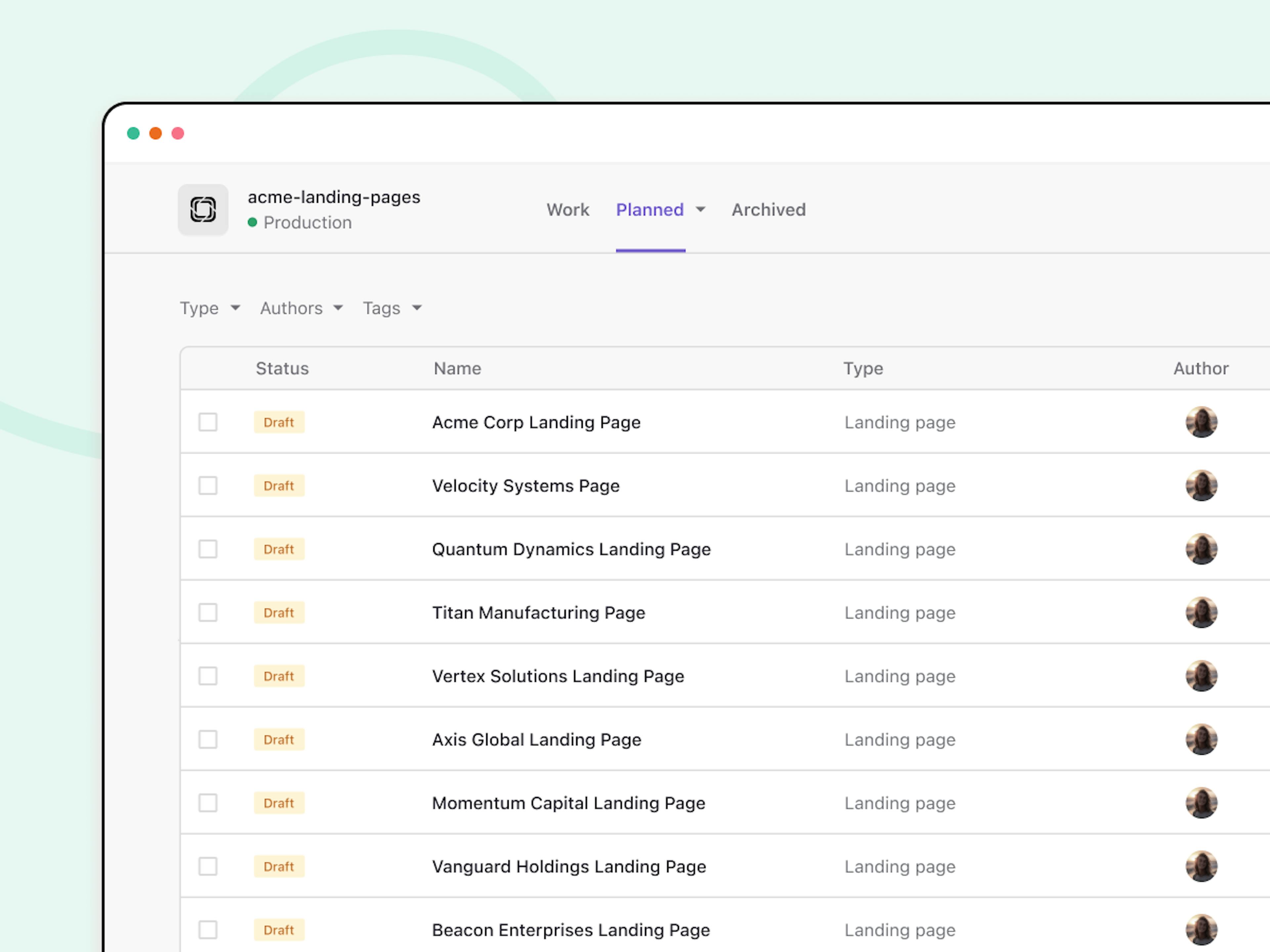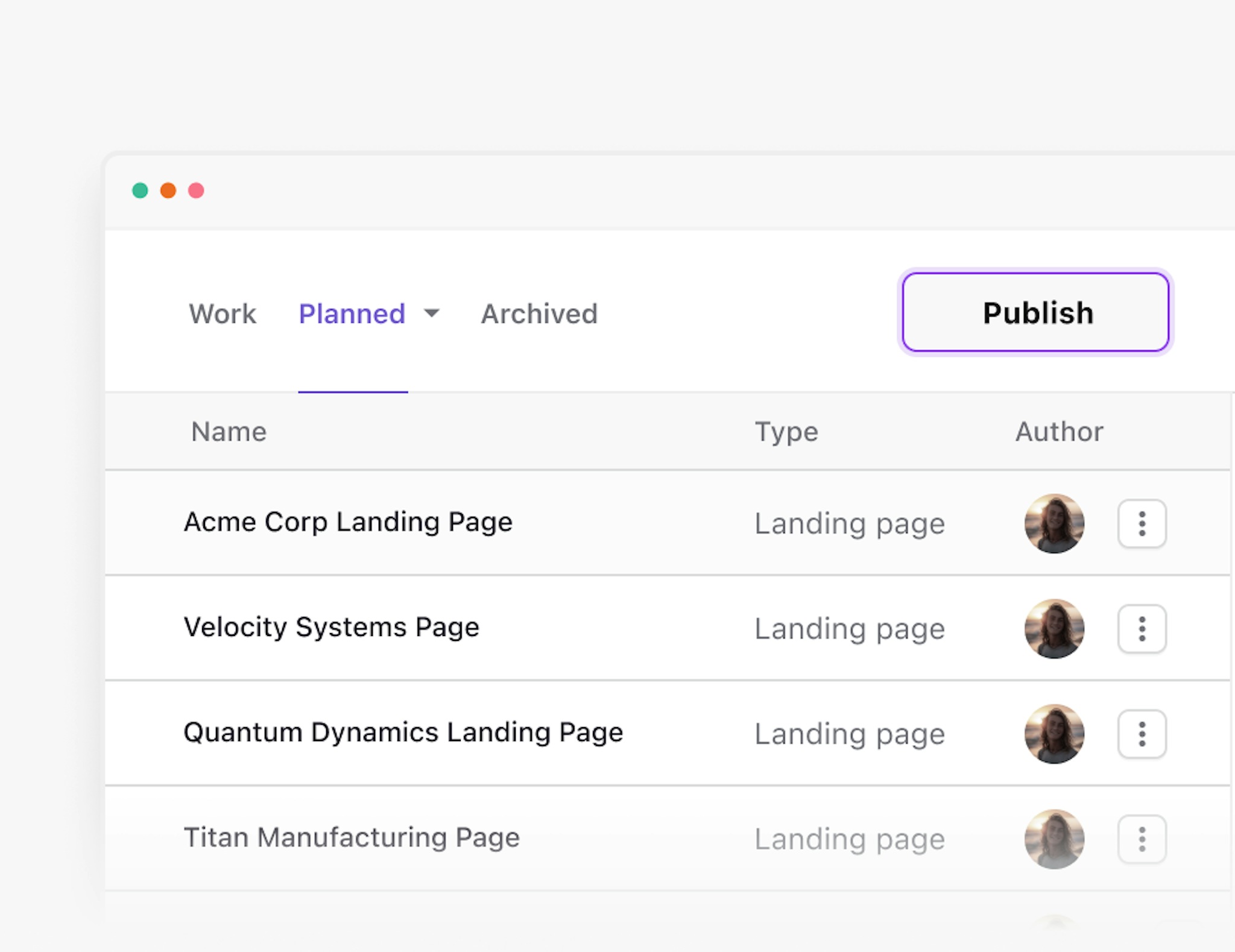 Control your releases. Enjoy your generated pages grouped nicely on one screen. Here you can review, approve, and publish each of them with a personalized, traceable URL.