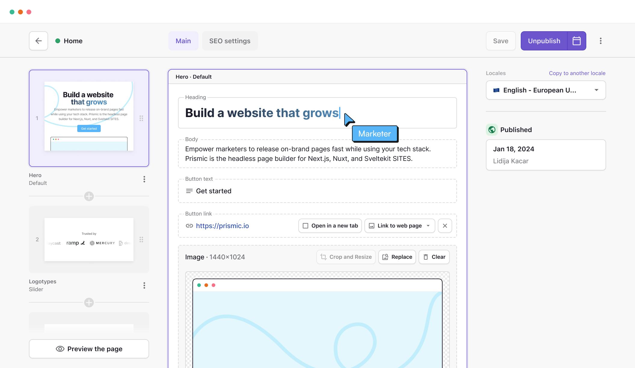 The Page Builder is where content writers manage and write content. Every piece of content that appears on a Prismic-powered website is composed in the Page Builder.