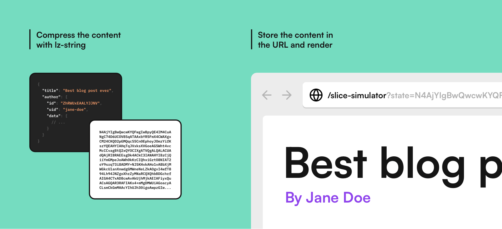 The content is a big JSON object and needs to be serialized before storing in the URL. <SliceSimulator>