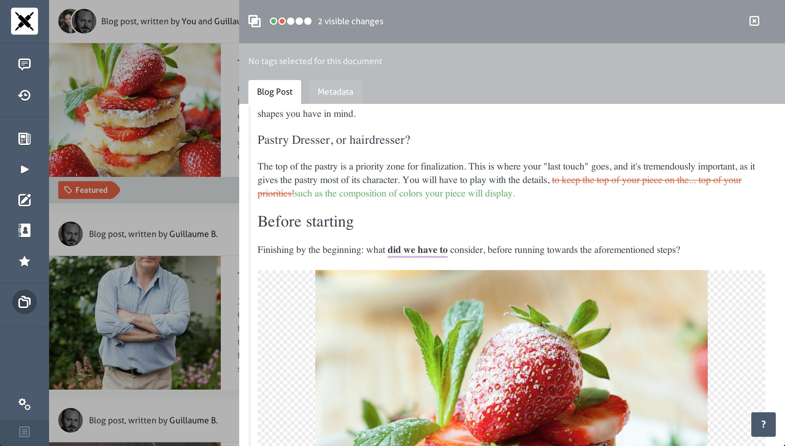 Another great benefit from maintaining a clean structured text appears when it comes to tracking changes. Computing and displaying differences between two rich text fragments is not an easy task, but thanks to the deep understanding of the text structure we have in prismic.io, it allows us to track changes in a very meaningful way.