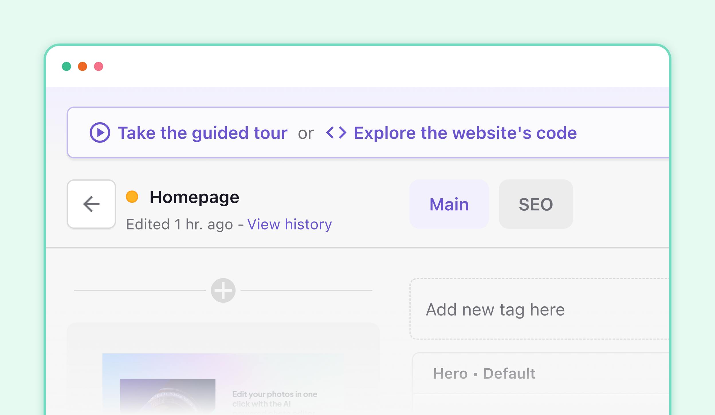 Developers can explore a real Next.js project built with Prismic right from the demo. At any point, clicking Explore the website’s code at the top of the Page Builder opens the demo website’s source code.