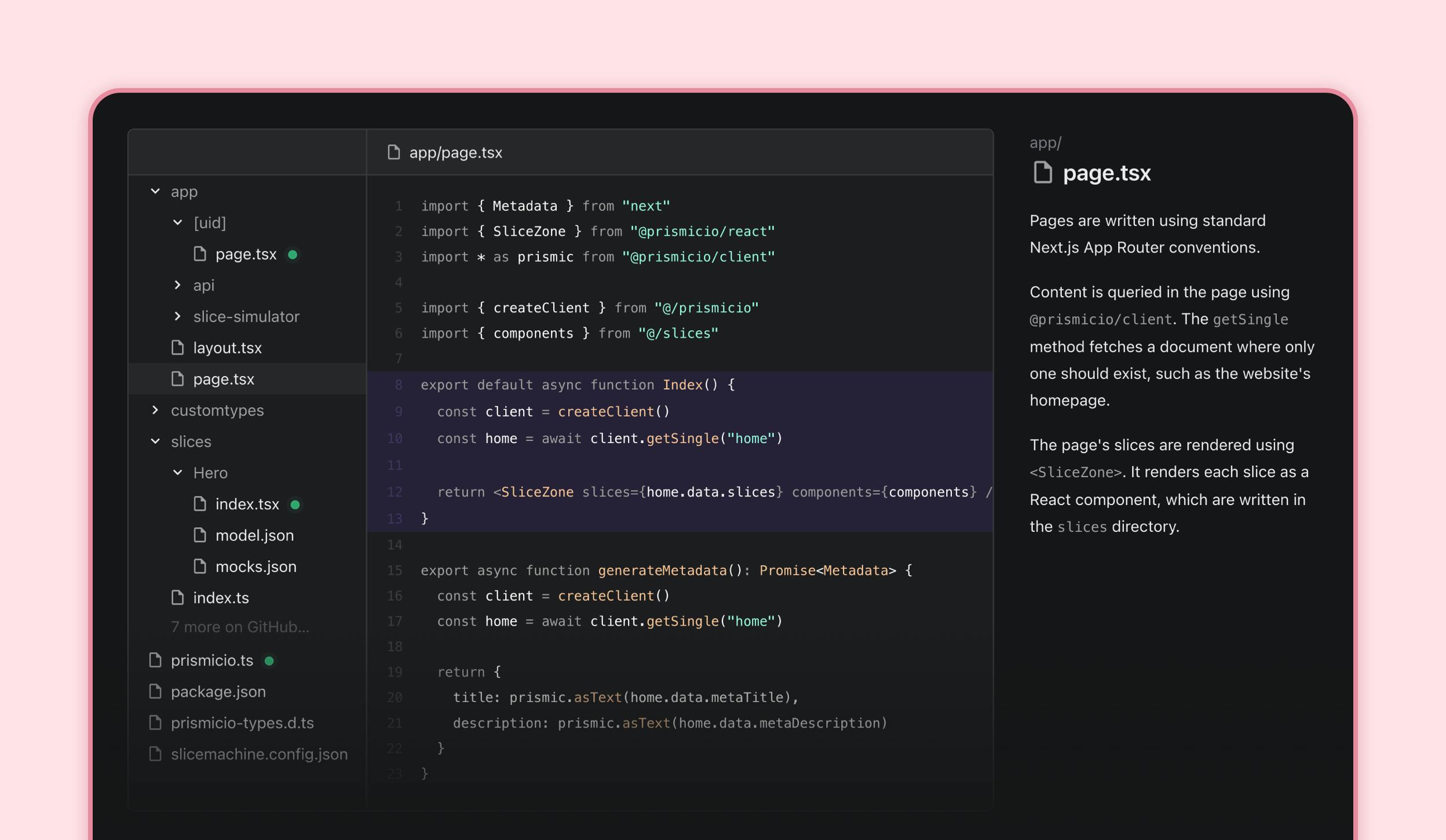 Each source file is paired with an explanation so there’s no confusion around a file’s purpose. Developers can learn how a Prismic website is structured and use the code as a reference during their first projects.