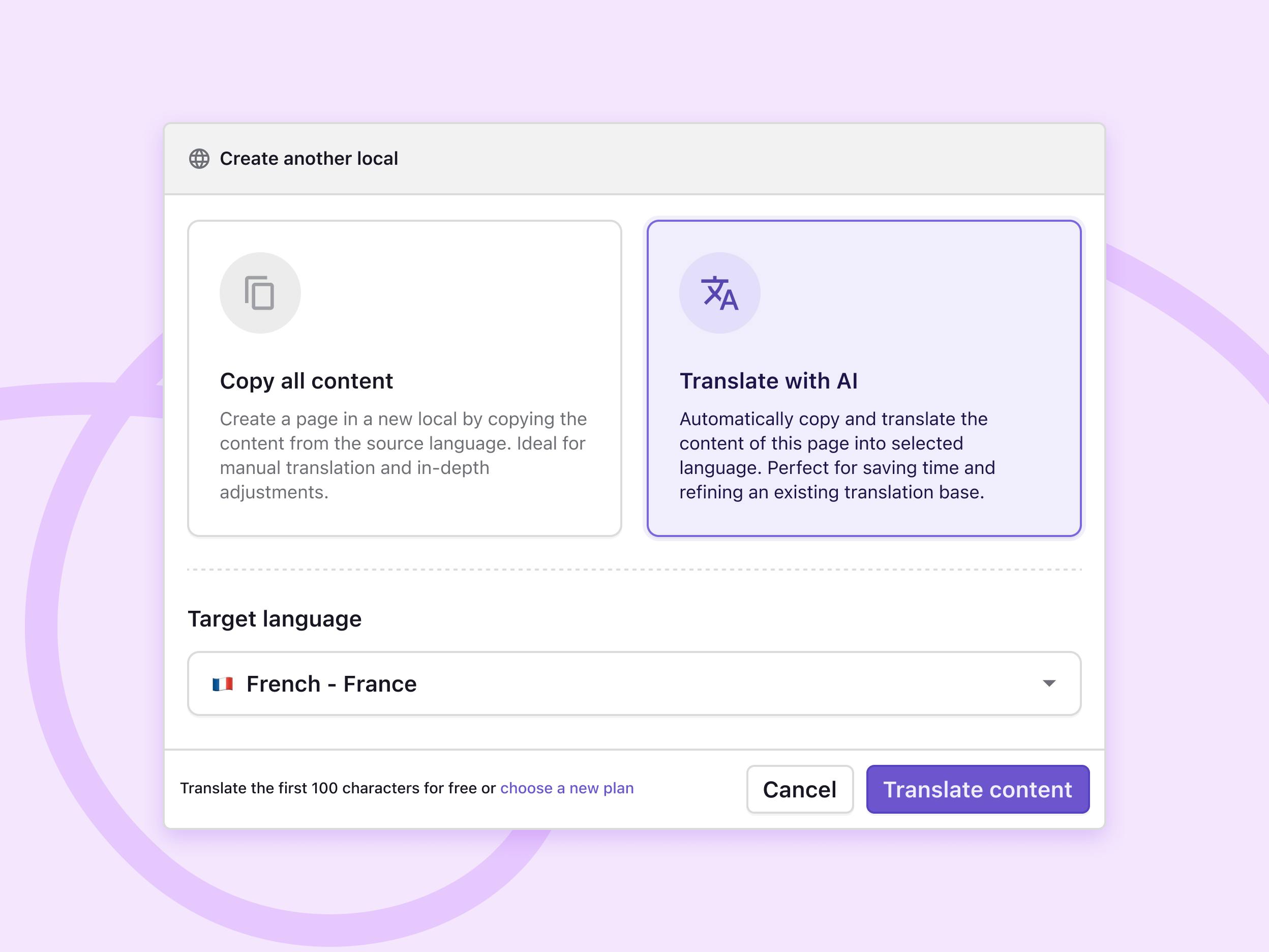 Translate entire pages in a click while preserving structure and brand voice. Whether you're localizing for one region or many, AI handles the heavy lifting so your team can focus on what matters next.