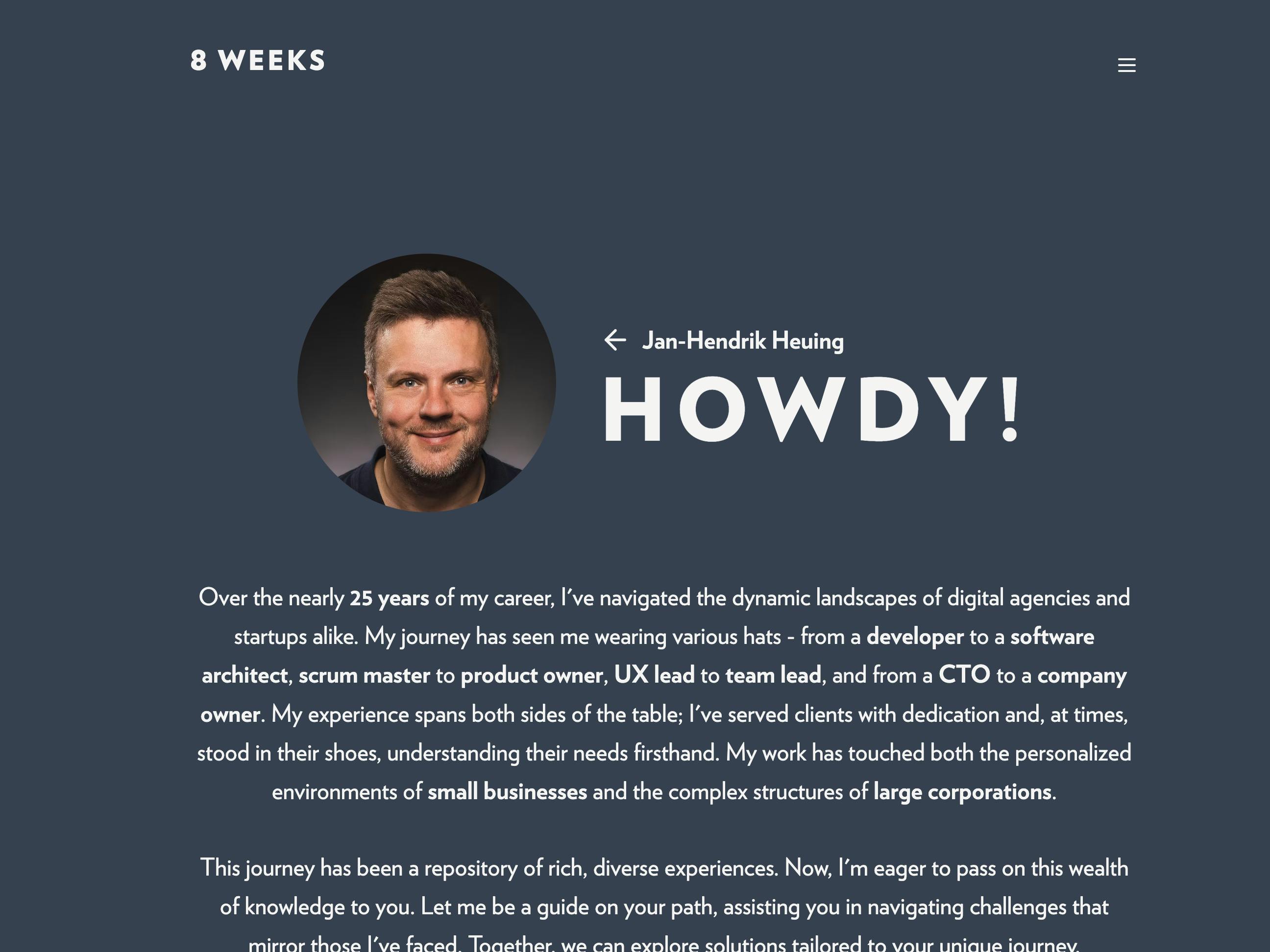 www.8weeks.ioWebsiteJan-Hendrik shares his knowledge from 25 years of startup and product development. He writes about startup, teams, products, culture and technology and shares his path of constant learnings.