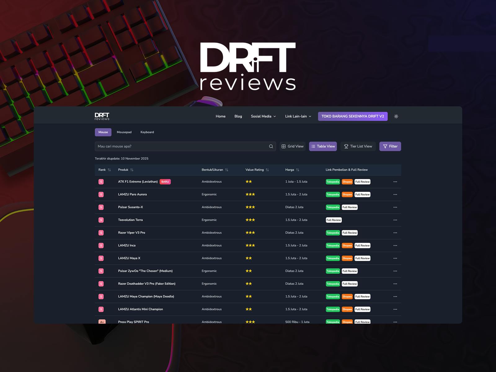 driftreviews.onlineWebsiteCreating DRiFT Reviews, specialising in in-depth reviews and recommendations for the best gaming mice, mousepads, and keyboards for the Indonesian.