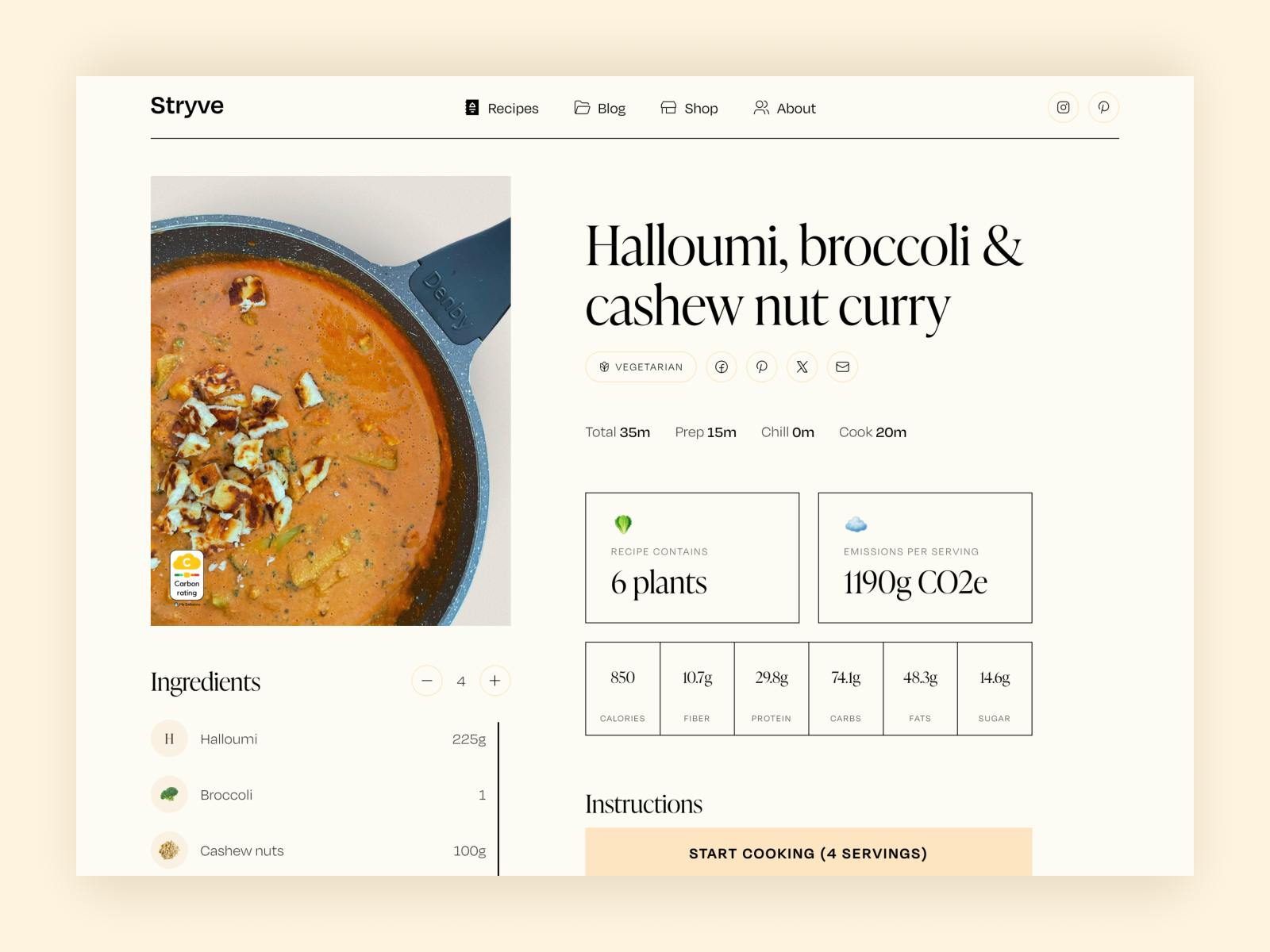 stryve.lifeWebsiteStryve was designed to make healthy cooking easy. The site includes a cooking mode to simplify the cooking process, carbon rating badges, estimated emissions, and more.