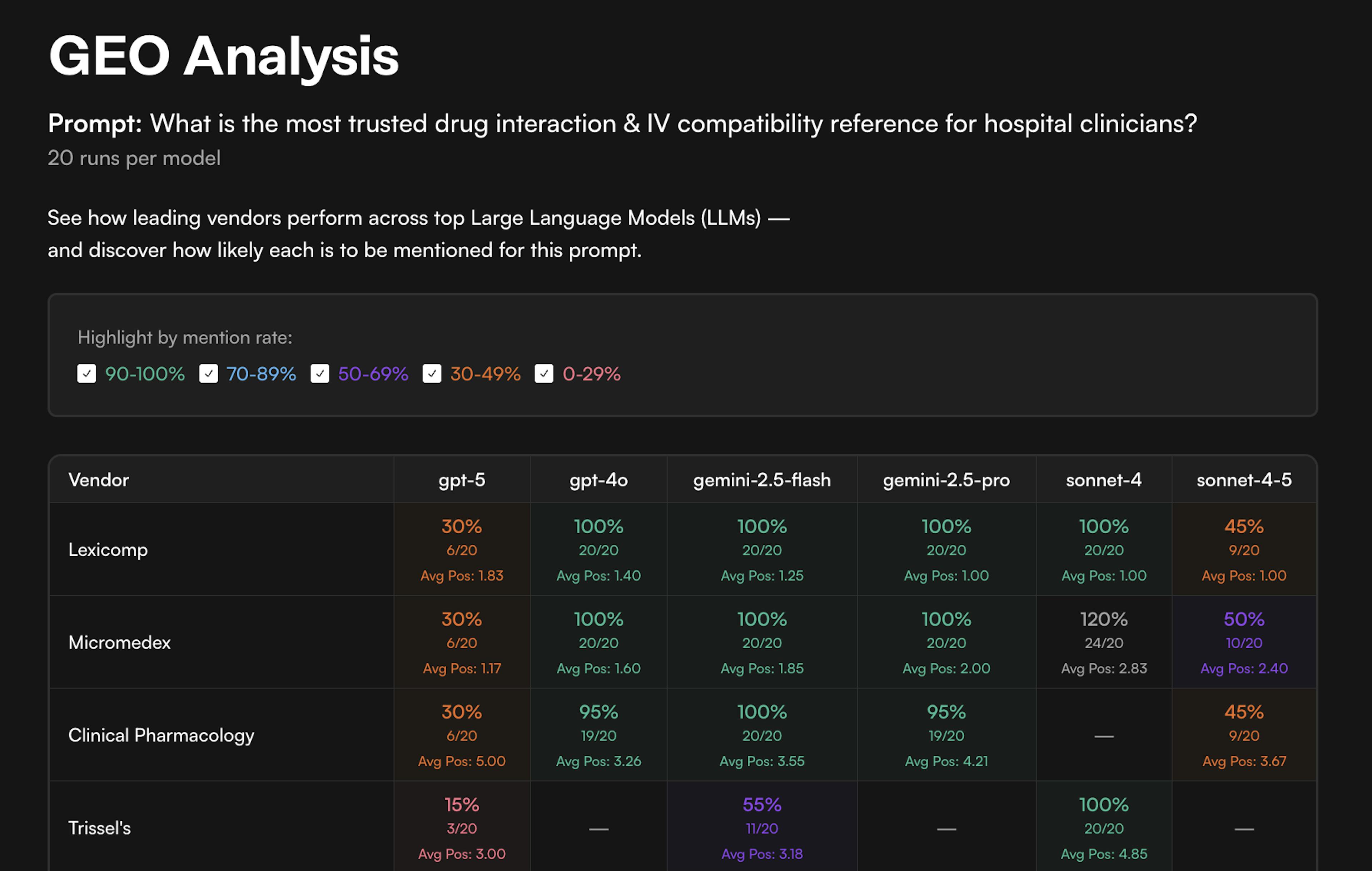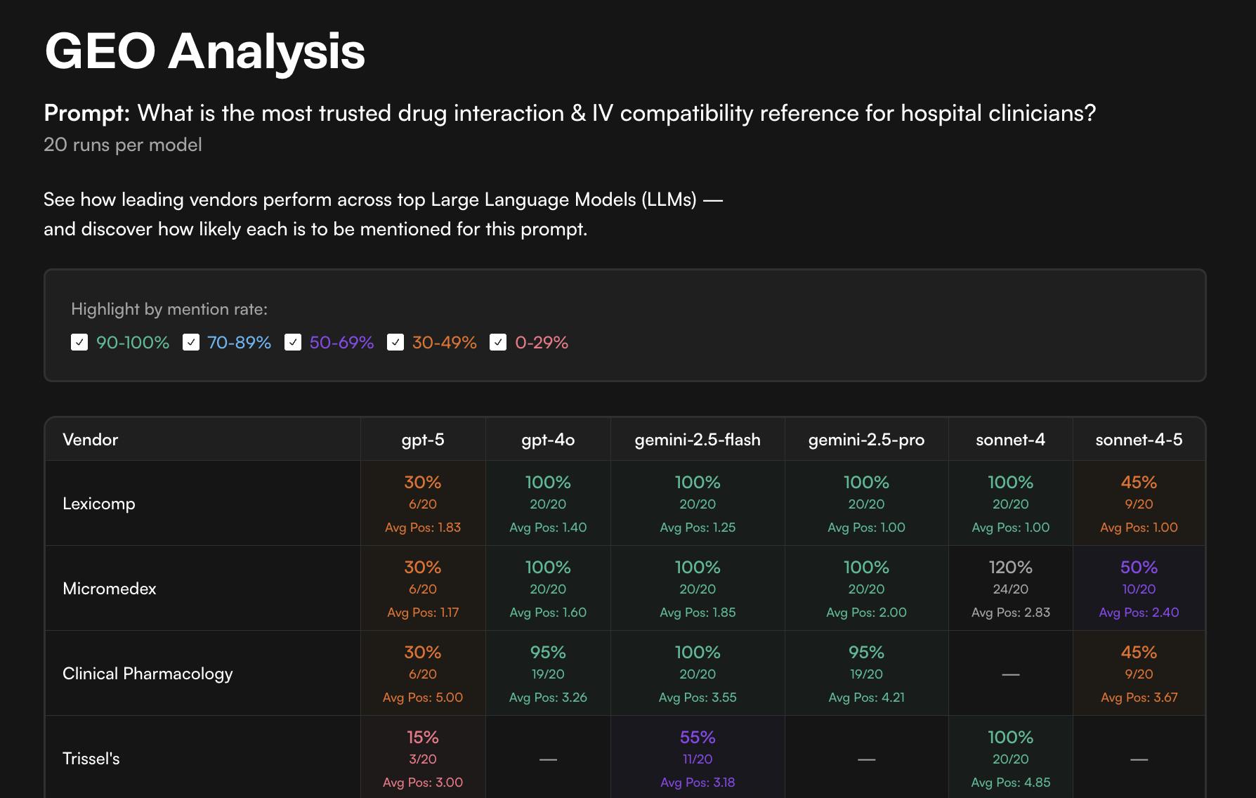 Compare your ranking vs. competitors, track how often you appear, and get quick wins to boost visibility across ChatGPT, Gemini, and Claude