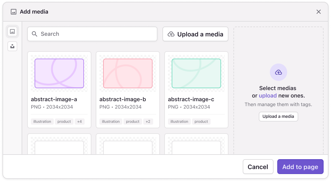 Upload images and other visual assets to Prismic's media library so you'll always have them ready when creating new pages. Images in Prismic are automatically optimized giving you faster page load times.