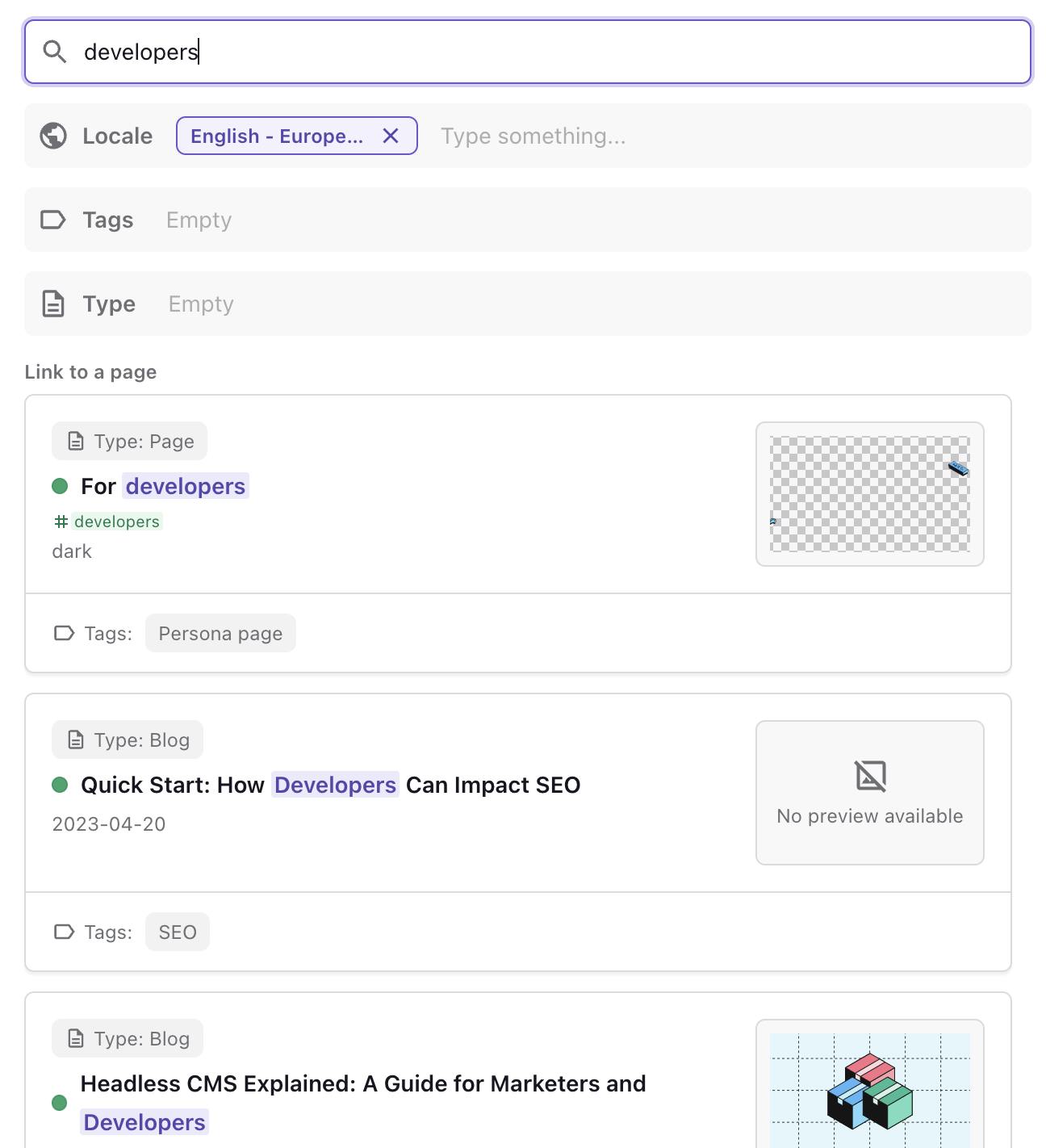 - When you are creating a link to another page in Prismic e.g. you're working on a blog page and you want to add a link to your home page, well when you search in this modal you will now see a highlight to show why results have been returned. For example, if there has been a match based on the page name or on the UID then you will see these items highlight