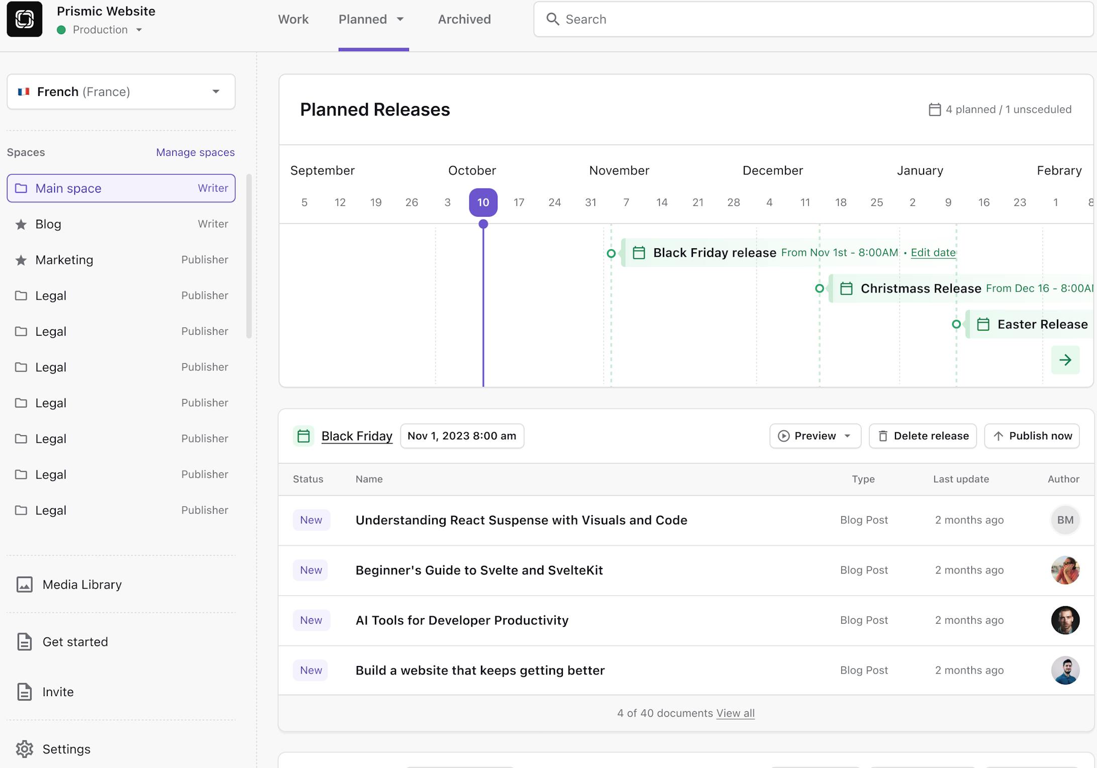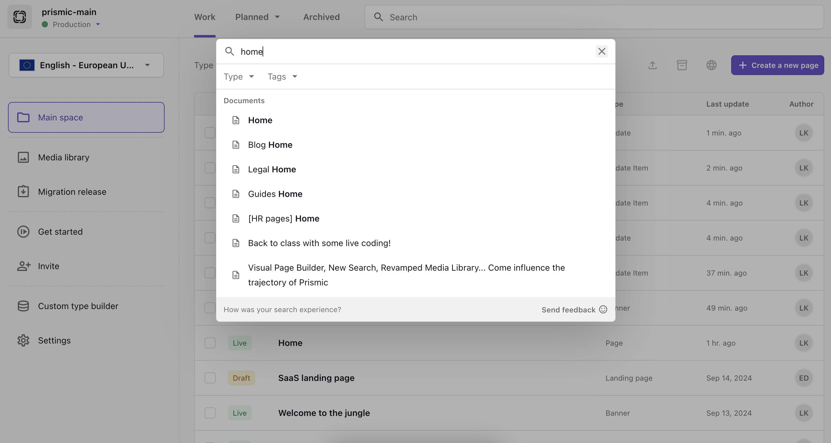 We’re thrilled to introduce our new page search. It is designed to help marketers find their pages faster and more reliably in Prismic. The new search prioritizes page names, boosting them to the top of the search results, making it easier to quickly find the pages you need to edit.