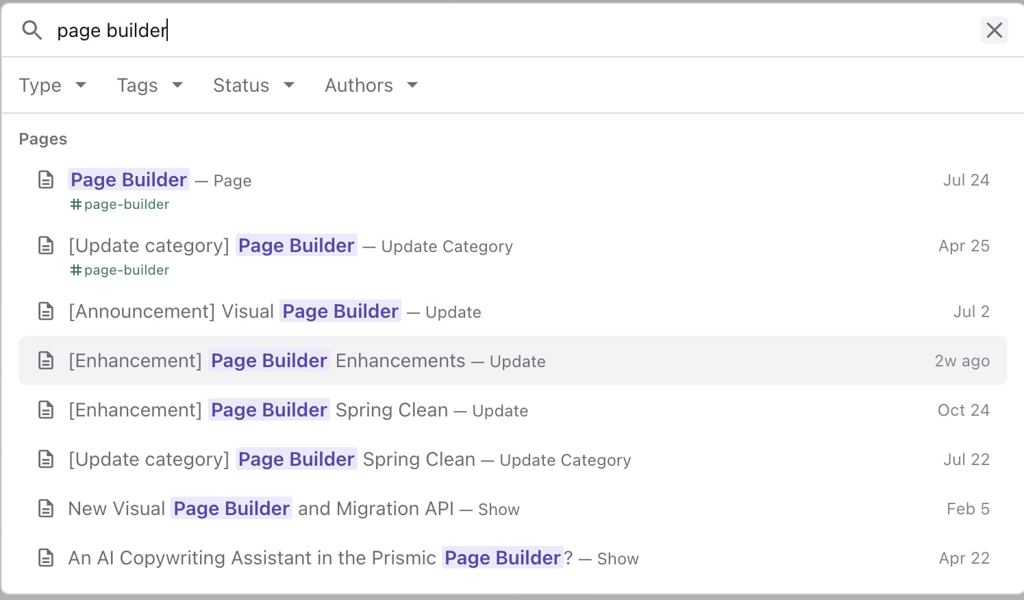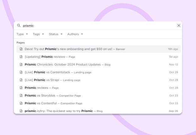 As part of our ongoing improvements, we’ve made key updates to Prismic’s search functionality this quarter to help you locate content faster and more accurately.