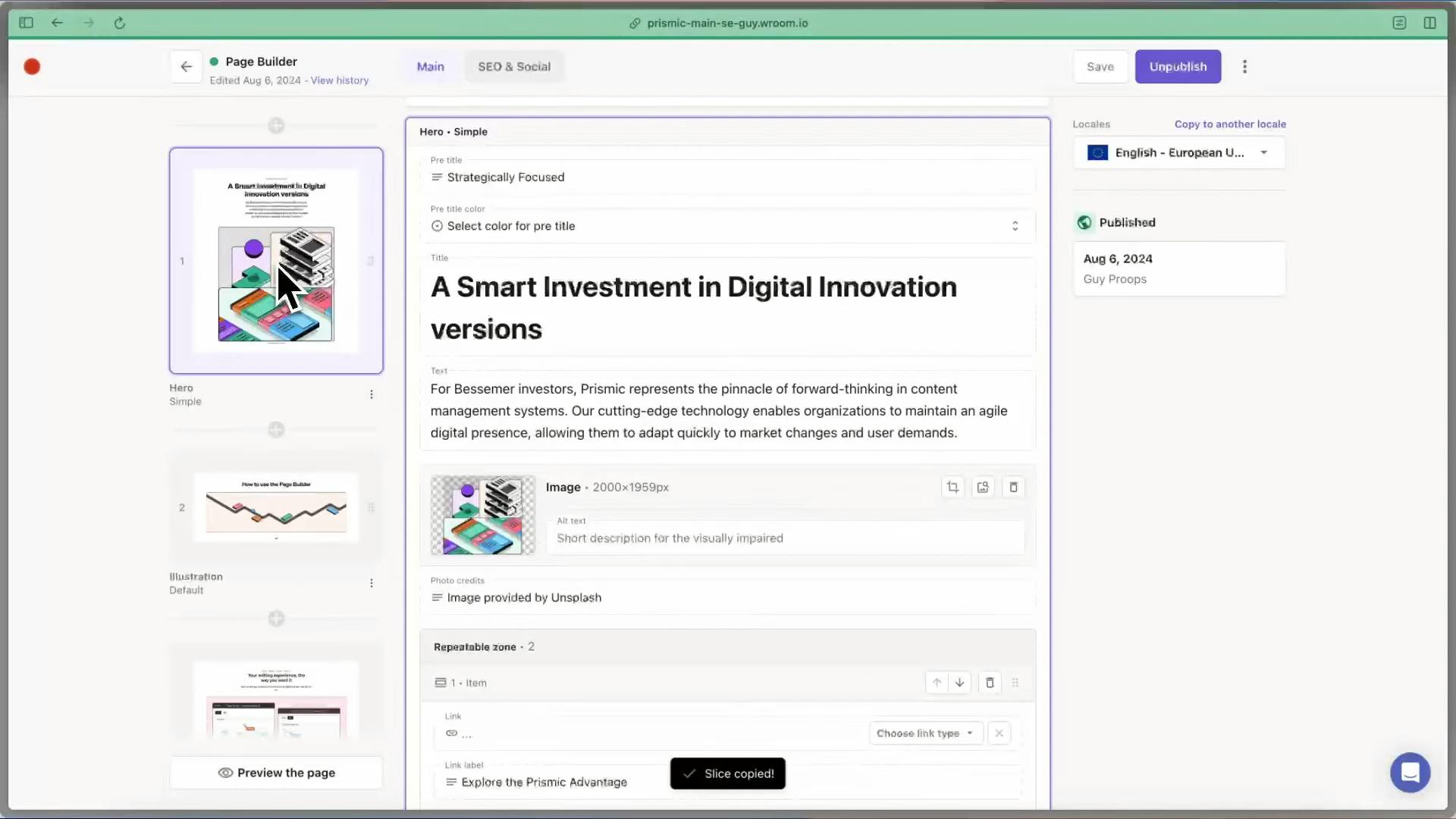 To address this, we are actively considering enhancements that will enable you to easily duplicate and reuse slices across your pages. Inspired by tools like Pitch, this potential update will allow you to effortlessly manage and replicate slices, saving you time and effort.