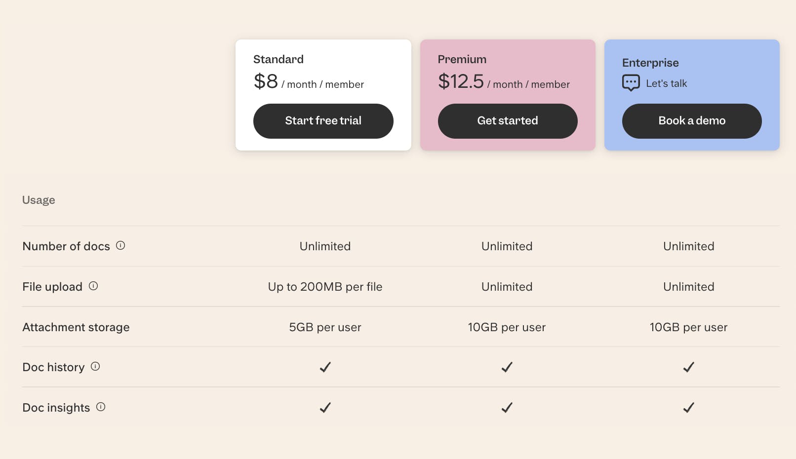 Example from Slite pricing page