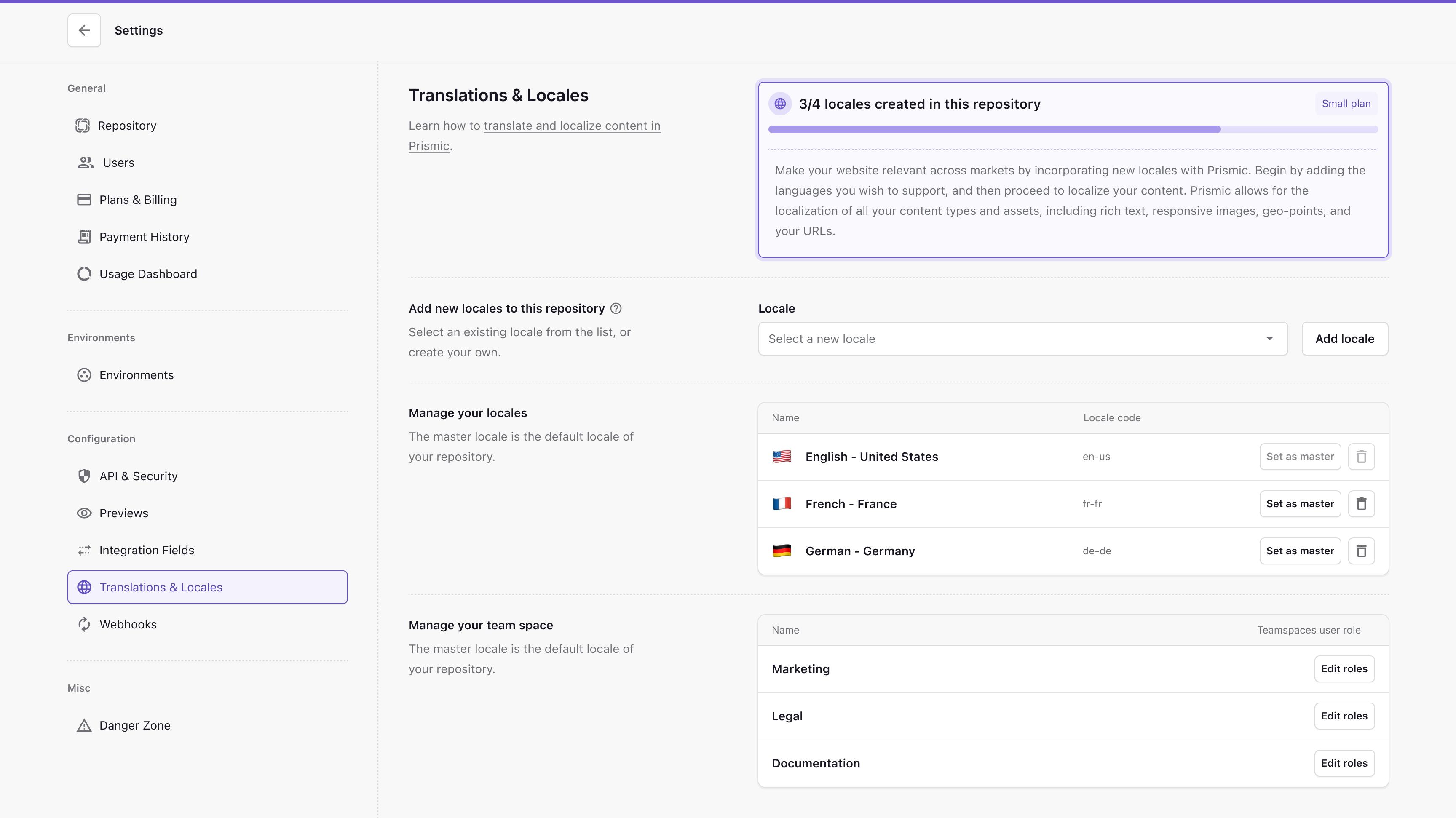 - Locale usage progress bar: You'll now see a clear progress bar that visually tracks how many locales you are currently using against the total number allowed by your plan. This gives you an instant understanding of where you stand.