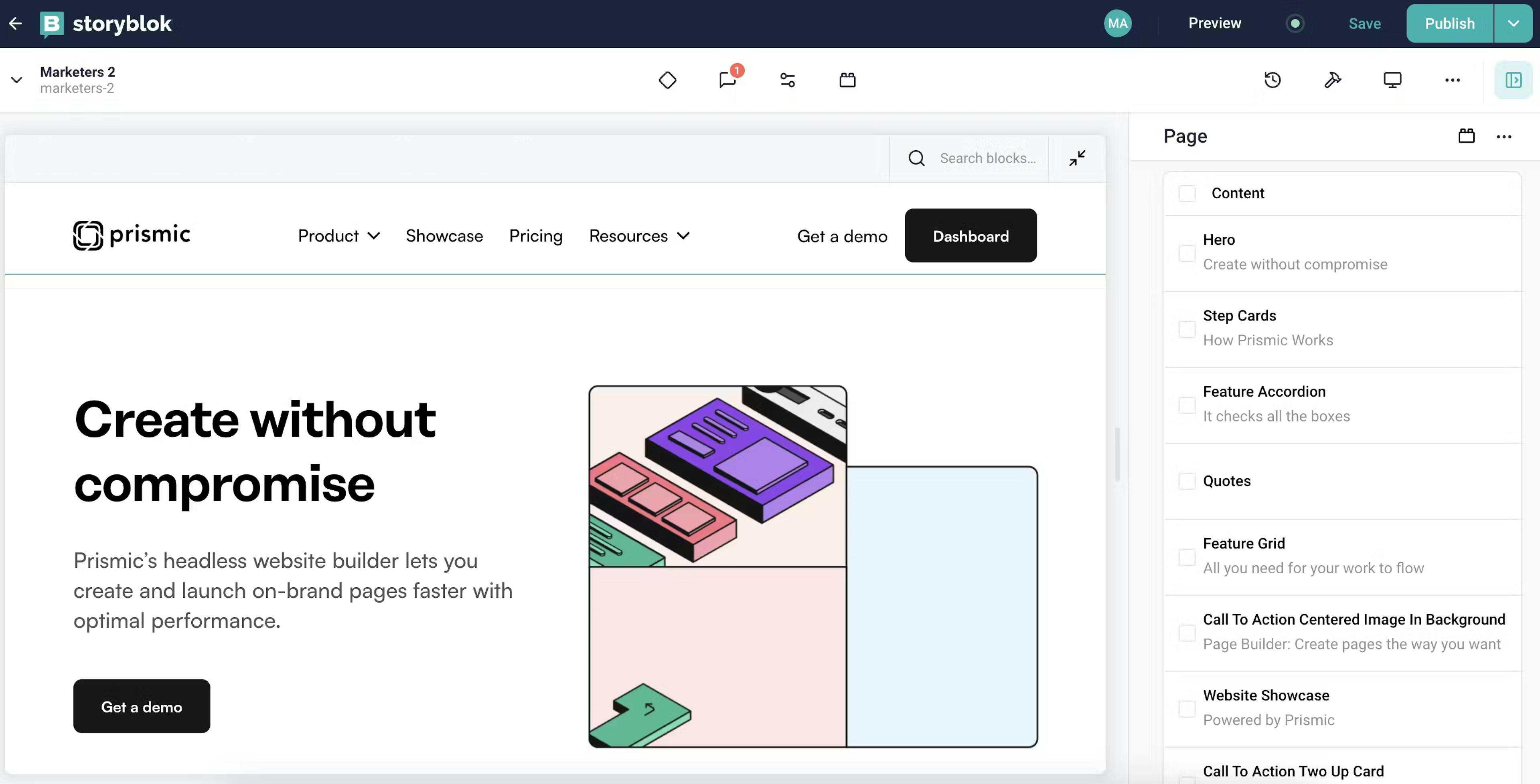 With Prismic’s Page Builder, you can build a page as if it were a slide deck. Break your page into sections and tackle each one at a time, from hero to CTA, splitting your work into manageable chunks.