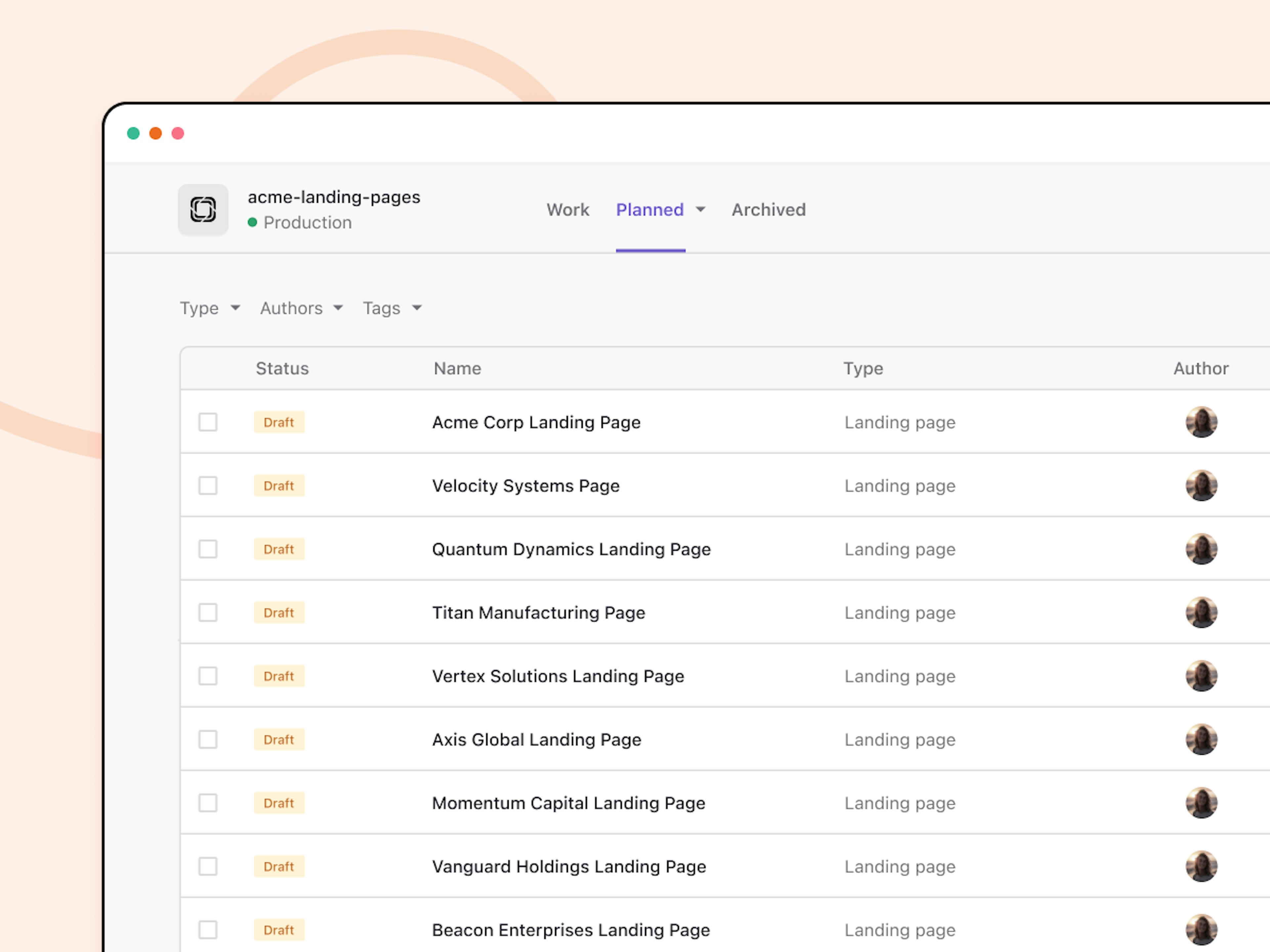 This is a marketing-only tool. Your team doesn't file developer tickets or wait for design resources. Pages arrive as editable drafts in organized batches, ready for review and approval before anything goes live.