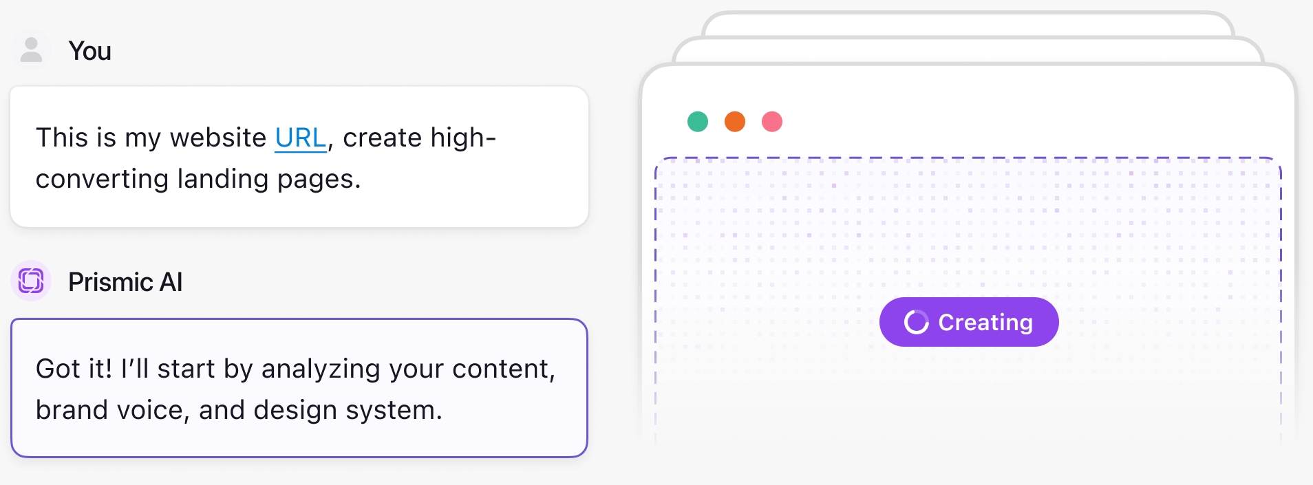 Enter your website URL. Our AI analyzes your content, brand voice, and design system to instantly generate editable landing pages you can refine and publish.